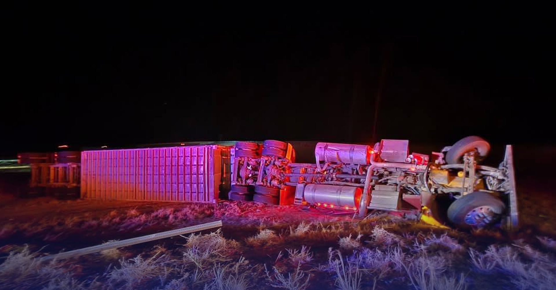 MORIARTY, Nuevo México – Al rededor de las 11:00 p.m. del miércoles, el Departamento de Bomberos de la Ciudad de Moriarty fue enviado al marcador de la milla 197 en la Interstate 40 tras el reporte de un camión volcado con atrapamiento.