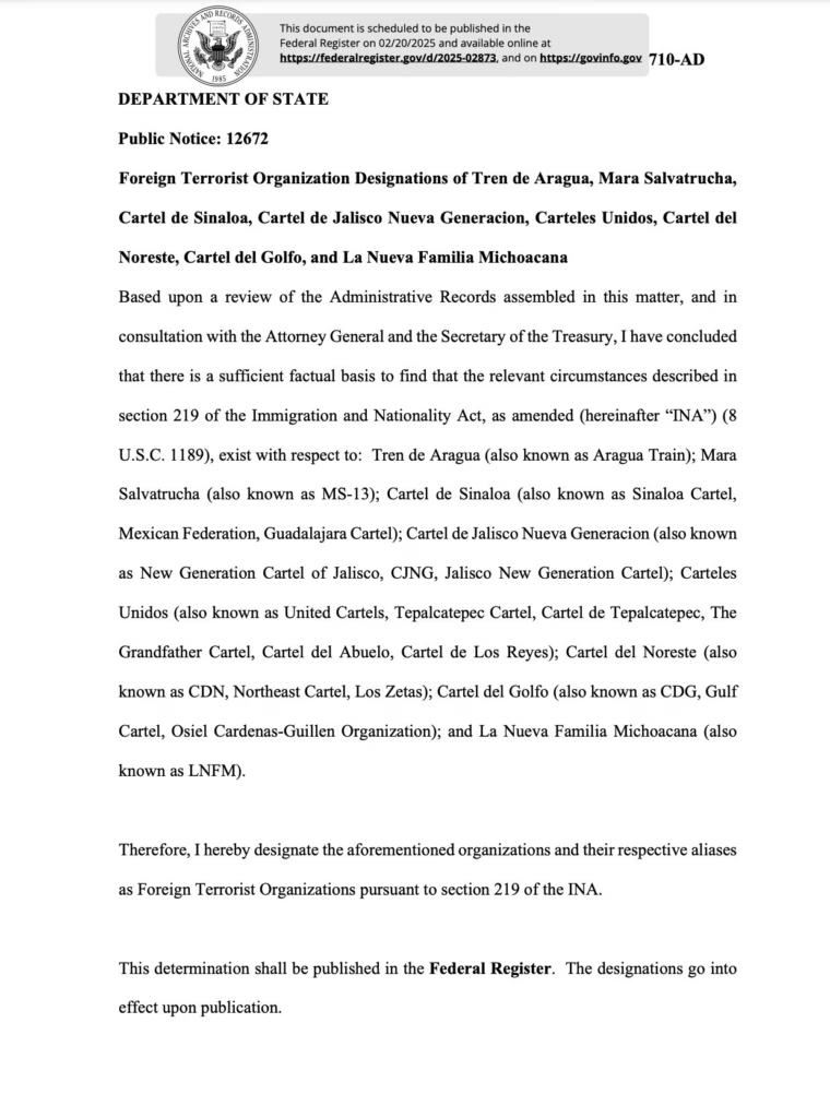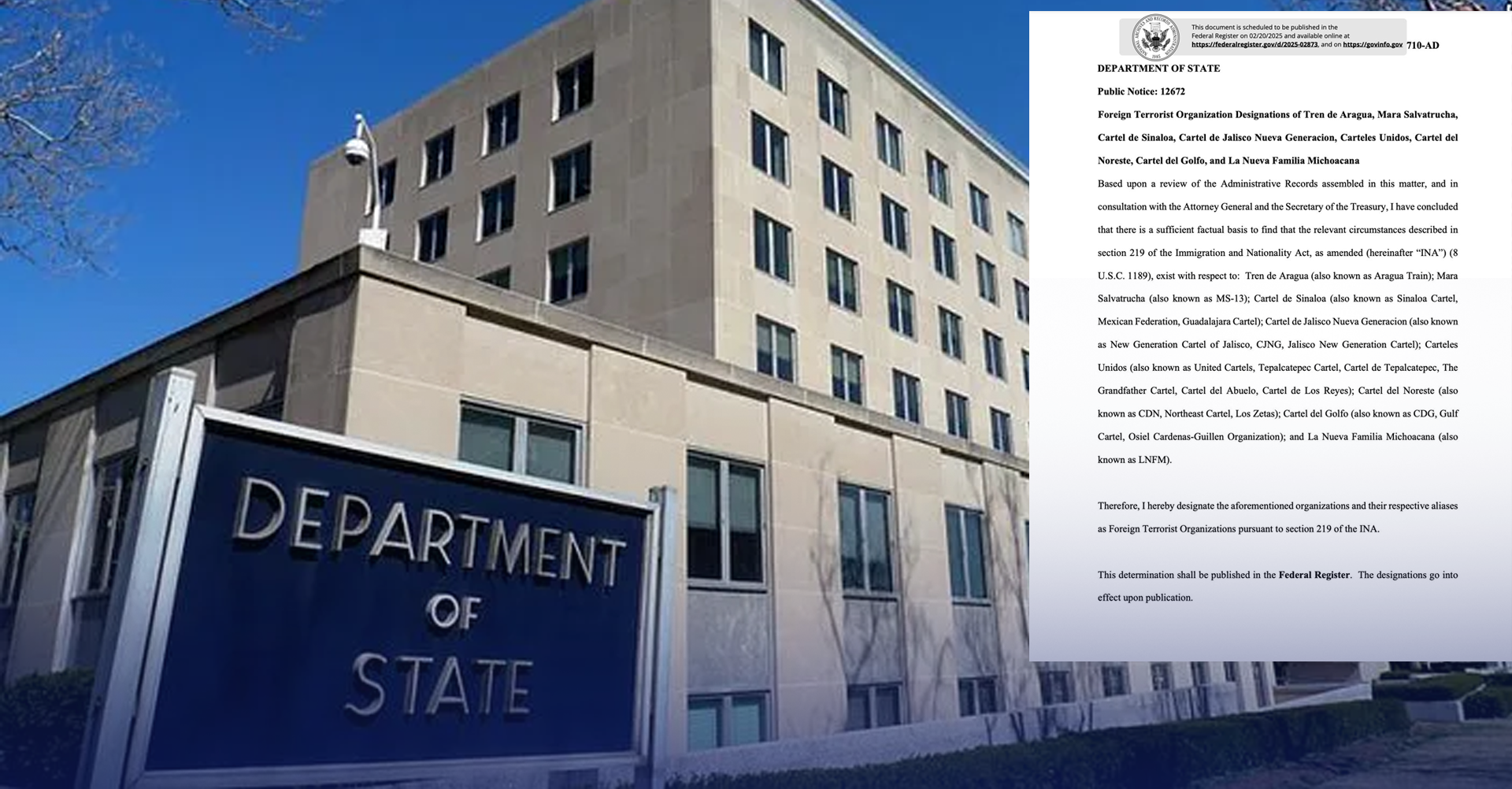 WASHINGTON, D.C. – En una medida histórica, el gobierno de Estados Unidos ha designado oficialmente al Tren de Aragua, Mara Salvatrucha (MS-13), Cártel de Sinaloa, Cártel de Jalisco Nueva Generación (CJNG), Cárteles Unidos, Cártel del Noreste, Cártel del Golfo y La Nueva Familia Michoacana como Organizaciones Terroristas Extranjeras, conforme a la Ley de Inmigración y Nacionalidad de EE. UU.