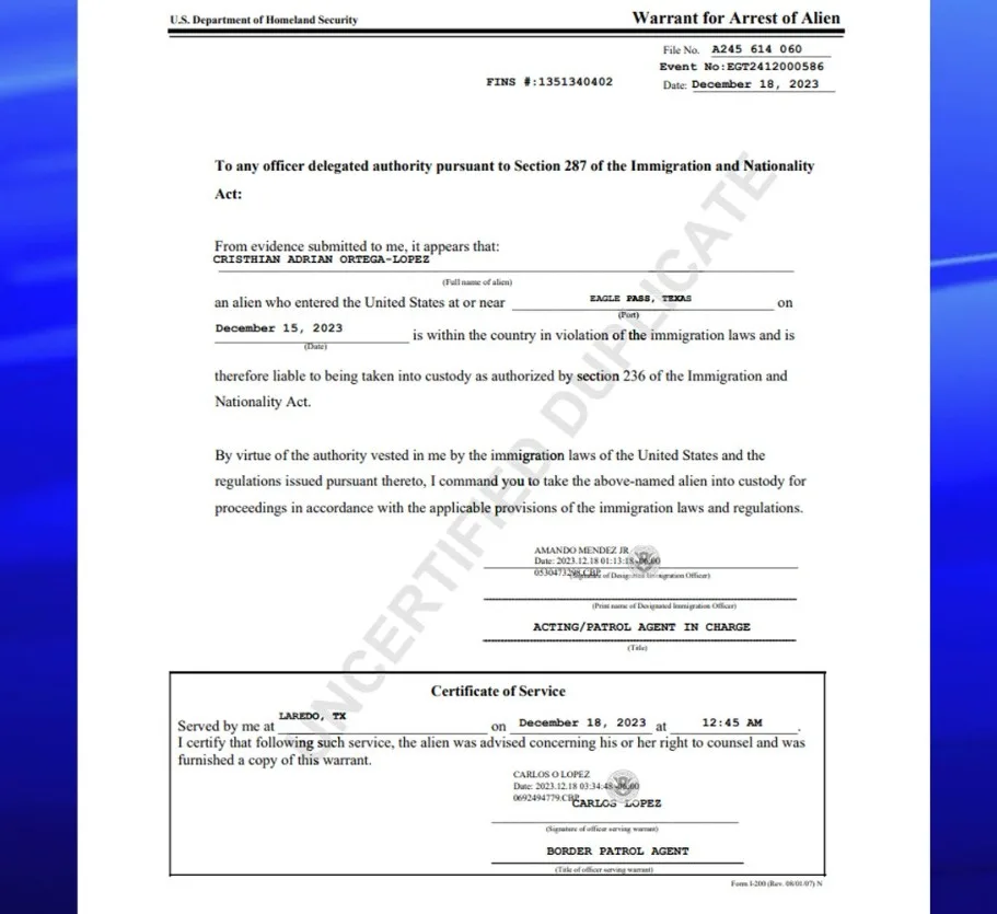 El 28 de febrero de 2024, agentes federales realizaron un cateo en la residencia y arrestaron a Ortega-López, quien fue acusado de posesión ilegal de armas y municiones, además de presencia ilegal en el país. Pese a las pruebas y a una evaluación que determinó que representaba un riesgo de fuga y un peligro para la comunidad, un juez federal ordenó su liberación bajo ciertas condiciones. El Departamento de Justicia apeló la decisión.