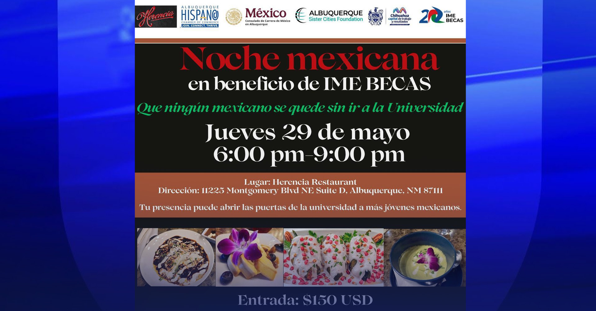ALBUQUERQUE, Nuevo México – El Restaurante Herencia, la Cámara de Comercio Hispana de Albuquerque, el Consulado de México en Albuquerque, Albuquerque Sister Cities y el Gobierno Municipal de Chihuahua te invitan a disfrutar de una Vibrante Noche Mexicana en apoyo a la educación.